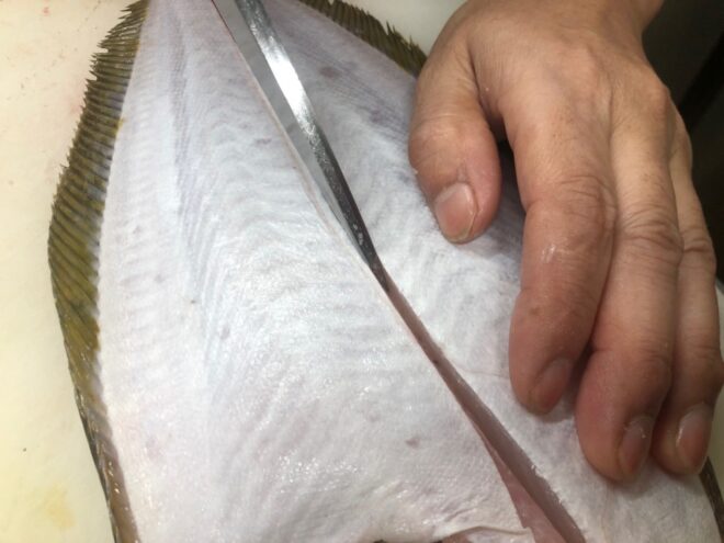 高級魚・・・久美浜産の「ヒラメ」をさばいている場面~っ