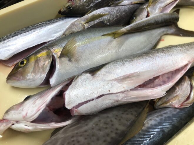 今朝の鮮魚・・・素早く内臓をとったりして処理♪この処理が早ければ早いほど鮮度が良いですよ♪