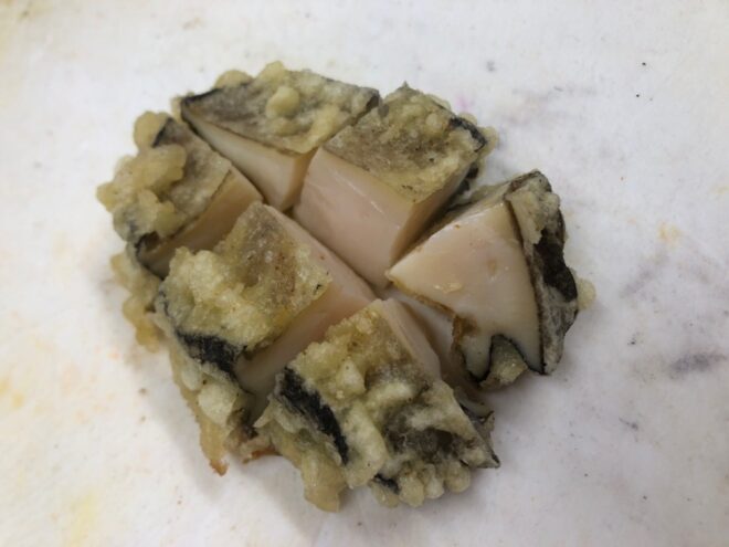 まるまる1個を天婦羅にしてから・・・豪快に「カット」・・・これの方が「レア」な部分もあって