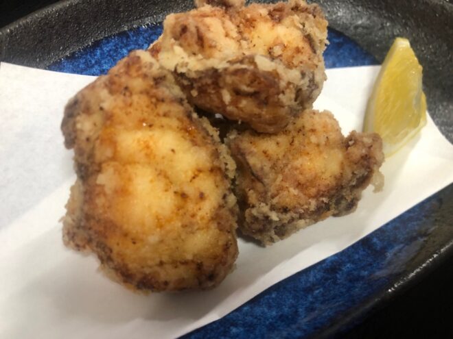 チェックイン時の日替わり別注品の「久美浜産の天然河豚(ふぐ)」の唐揚げ・・・